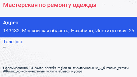Мастерская по ремонту одежды по адресу 143432, Московская область, Нахабино, Институтская, 25 в дальнейшем Организация, размещена в следующих категориях: