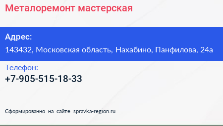 Металоремонт, мастерская по адресу 143432, Московская область, Нахабино, Панфилова, 24а в дальнейшем Организация, размещена в следующих категориях: