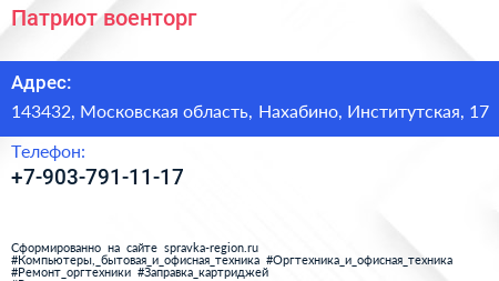 Патриот, военторг по адресу 143432, Московская область, Нахабино, Институтская, 17 в дальнейшем Организация, размещена в следующих категориях: