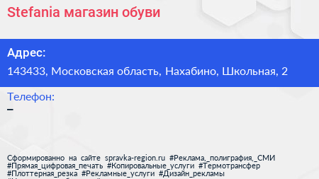 Stefania, магазин обуви по адресу 143433, Московская область, Нахабино, Школьная, 2 в дальнейшем Организация, размещена в следующих категориях:
