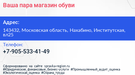 Ваша пара, магазин обуви по адресу 143432, Московская область, Нахабино, Институтская, вл25 в дальнейшем Организация, размещена в следующих категориях: