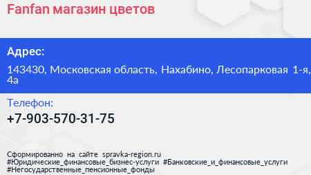 Fanfan, магазин цветов по адресу 143430, Московская область, Нахабино, Лесопарковая 1-я, 4а в дальнейшем Организация, размещена в следующих категориях: