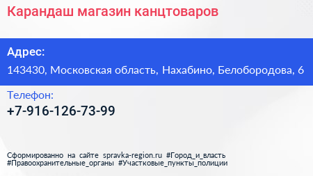 Карандаш, магазин канцтоваров по адресу 143430, Московская область, Нахабино, Белобородова, 6 в дальнейшем Организация, размещена в следующих категориях: