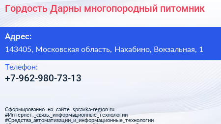 Гордость Дарны, многопородный питомник по адресу 143405, Московская область, Нахабино, Вокзальная, 1 в дальнейшем Организация, размещена в следующих категориях: