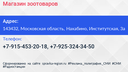 Магазин зоотоваров по адресу 143432, Московская область, Нахабино, Институтская, 3а в дальнейшем Организация, размещена в следующих категориях: