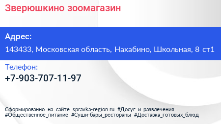 Зверюшкино, зоомагазин по адресу 143433, Московская область, Нахабино, Школьная, 8 ст1 в дальнейшем Организация, размещена в следующих категориях: