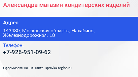 Александра, магазин кондитерских изделий по адресу 143430, Московская область, Нахабино, Железнодорожная, 18 в дальнейшем Организация, размещена в следующих категориях:
