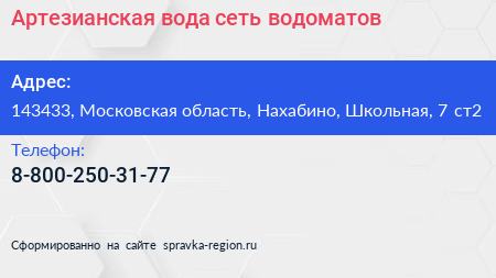 Артезианская вода, сеть водоматов по адресу 143433, Московская область, Нахабино, Школьная, 7 ст2 в дальнейшем Организация, размещена в следующих категориях:
