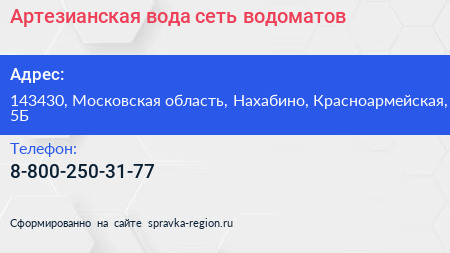 Артезианская вода, сеть водоматов по адресу 143430, Московская область, Нахабино, Красноармейская, 5Б в дальнейшем Организация, размещена в следующих категориях: