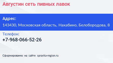 Августин, сеть пивных лавок по адресу 143430, Московская область, Нахабино, Белобородова, 8 в дальнейшем Организация, размещена в следующих категориях: