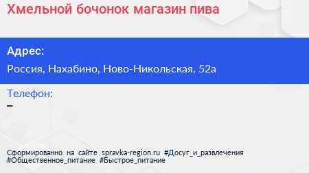Хмельной бочонок, магазин пива по адресу Торговый центр "Никольский", 52Б, Ново-Никольская улица, Опалиха, Красногорск, городской округ Красногорск, Московская область, Центральный федеральный округ, 143443, Россия в дальнейшем Организация, размещена в следующих категориях: