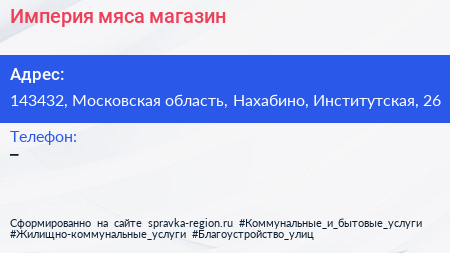 Империя мяса, магазин по адресу 143432, Московская область, Нахабино, Институтская, 26 в дальнейшем Организация, размещена в следующих категориях: