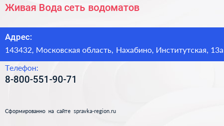 Живая Вода, сеть водоматов по адресу 143432, Московская область, Нахабино, Институтская, 13а в дальнейшем Организация, размещена в следующих категориях: