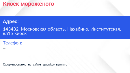 Киоск мороженого по адресу 143432, Московская область, Нахабино, Институтская, вл15 киоск в дальнейшем Организация, размещена в следующих категориях:
