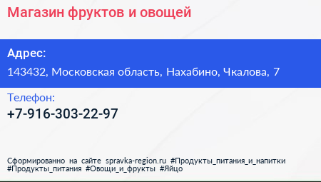 Магазин фруктов и овощей по адресу 143432, Московская область, Нахабино, Чкалова, 7 в дальнейшем Организация, размещена в следующих категориях:
