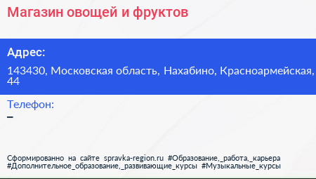 Магазин овощей и фруктов по адресу 143430, Московская область, Нахабино, Красноармейская, 44 в дальнейшем Организация, размещена в следующих категориях: