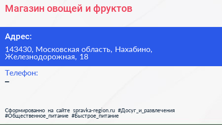 Магазин овощей и фруктов по адресу 143430, Московская область, Нахабино, Железнодорожная, 18 в дальнейшем Организация, размещена в следующих категориях: