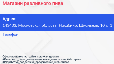 Магазин разливного пива по адресу 143433, Московская область, Нахабино, Школьная, 10 ст1 в дальнейшем Организация, размещена в следующих категориях: