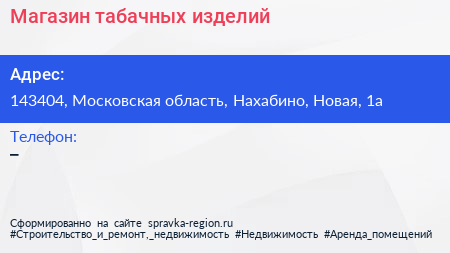 Магазин табачных изделий по адресу 143404, Московская область, Нахабино, Новая, 1а в дальнейшем Организация, размещена в следующих категориях: