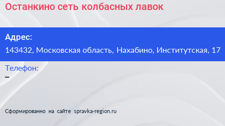 Останкино, сеть колбасных лавок по адресу 143432, Московская область, Нахабино, Институтская, 17 в дальнейшем Организация, размещена в следующих категориях:
