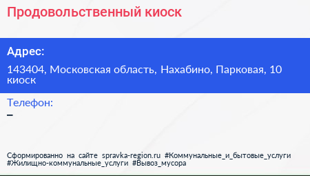 Продовольственный киоск по адресу 143404, Московская область, Нахабино, Парковая, 10 киоск в дальнейшем Организация, размещена в следующих категориях: