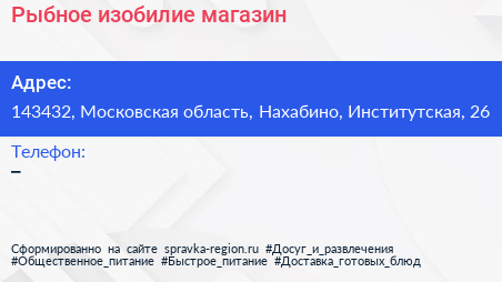 Рыбное изобилие, магазин по адресу 143432, Московская область, Нахабино, Институтская, 26 в дальнейшем Организация, размещена в следующих категориях: