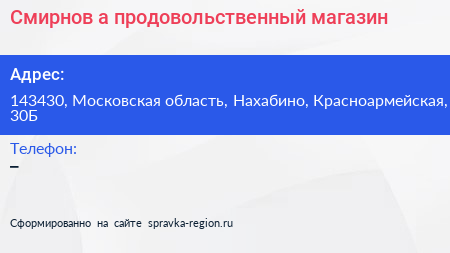 Смирнов-а, продовольственный магазин по адресу 143430, Московская область, Нахабино, Красноармейская, 30Б в дальнейшем Организация, размещена в следующих категориях: