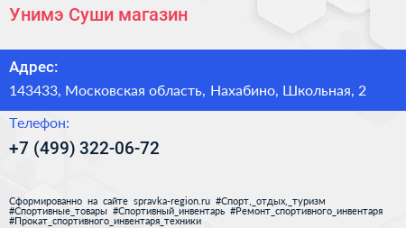 Унимэ Суши, магазин по адресу 143433, Московская область, Нахабино, Школьная, 2 в дальнейшем Организация, размещена в следующих категориях: