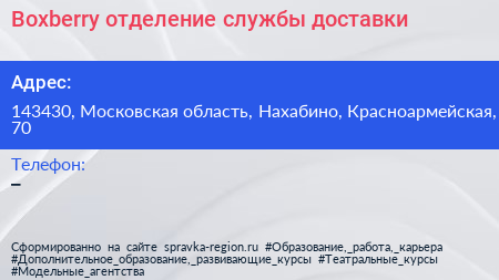 Boxberry, отделение службы доставки по адресу 143430, Московская область, Нахабино, Красноармейская, 70 в дальнейшем Организация, размещена в следующих категориях: