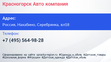 Красногорск-Авто, компания по адресу 2 с1, Серебряный бульвар, Жилой комплекс «Миниполис Серебрица», Опалиха, Красногорск, городской округ Красногорск, Московская область, Центральный федеральный округ, 143405, Россия в дальнейшем Организация, размещена в следующих категориях: