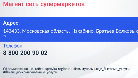 Магнит, сеть супермаркетов по адресу 143433, Московская область, Нахабино, Братьев Волковых, 5 в дальнейшем Организация, размещена в следующих категориях: