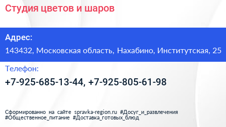 Студия цветов и шаров по адресу 143432, Московская область, Нахабино, Институтская, 25 в дальнейшем Организация, размещена в следующих категориях: