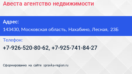 Авеста, агентство недвижимости по адресу 143430, Московская область, Нахабино, Лесная, 23Б в дальнейшем Организация, размещена в следующих категориях: