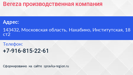 Bereza, производственная компания по адресу 143432, Московская область, Нахабино, Институтская, 18 ст2 в дальнейшем Организация, размещена в следующих категориях: