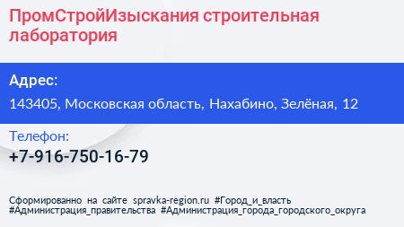 ПромСтройИзыскания, строительная лаборатория по адресу 143405, Московская область, Нахабино, Зелёная, 12 в дальнейшем Организация, размещена в следующих категориях:
