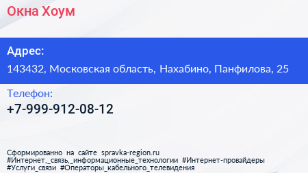 Окна Хоум по адресу 143432, Московская область, Нахабино, Панфилова, 25 в дальнейшем Организация, размещена в следующих категориях: