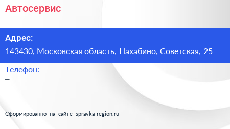 Автосервис по адресу 143430, Московская область, Нахабино, Советская, 25 в дальнейшем Организация, размещена в следующих категориях: