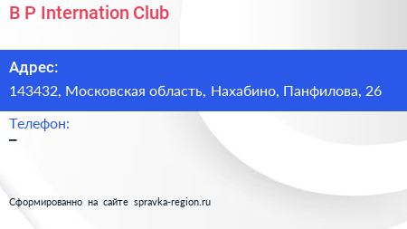B & P Internation Club по адресу 143432, Московская область, Нахабино, Панфилова, 26 в дальнейшем Организация, размещена в следующих категориях: