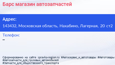 Барс, магазин автозапчастей по адресу 143432, Московская область, Нахабино, Лагерная, 20 ст2 в дальнейшем Организация, размещена в следующих категориях: