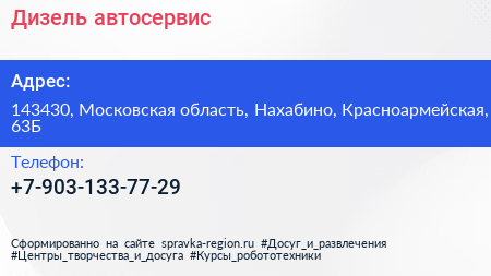 Дизель, автосервис по адресу 143430, Московская область, Нахабино, Красноармейская, 63Б в дальнейшем Организация, размещена в следующих категориях: