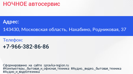 НОЧНОЕ, автосервис по адресу 143430, Московская область, Нахабино, Родниковая, 37 в дальнейшем Организация, размещена в следующих категориях: