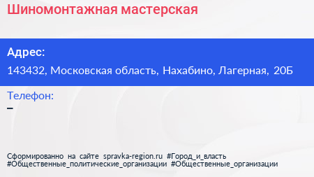 Шиномонтажная мастерская по адресу 143432, Московская область, Нахабино, Лагерная, 20Б в дальнейшем Организация, размещена в следующих категориях: