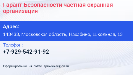 Гарант Безопасности, частная охранная организация по адресу 143433, Московская область, Нахабино, Школьная, 13 в дальнейшем Организация, размещена в следующих категориях: