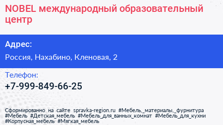 NOBEL, международный образовательный центр по адресу Детский клуб «Клёново», 2, Кленовая улица, КП «Клёново», Опалиха, Красногорск, городской округ Красногорск, Московская область, Центральный федеральный округ, 143443, Россия в дальнейшем Организация, размещена в следующих категориях: