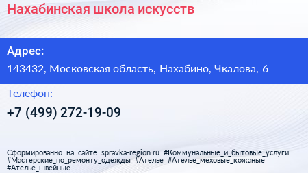 Нахабинская школа искусств по адресу 143432, Московская область, Нахабино, Чкалова, 6 в дальнейшем Организация, размещена в следующих категориях: