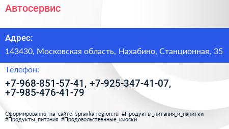 Автосервис по адресу 143430, Московская область, Нахабино, Станционная, 35 в дальнейшем Организация, размещена в следующих категориях: