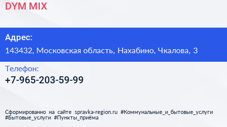 DYM MIX по адресу 143432, Московская область, Нахабино, Чкалова, 3 в дальнейшем Организация, размещена в следующих категориях: