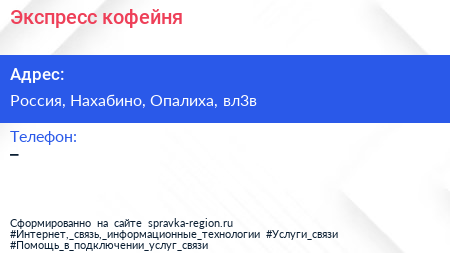 Экспресс-кофейня по адресу Продукты на станции Опалиха, улица Опалиха, Опалиха, Красногорск, городской округ Красногорск, Московская область, Центральный федеральный округ, 143405, Россия в дальнейшем Организация, размещена в следующих категориях: