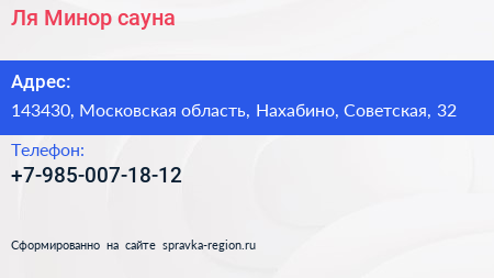 Ля Минор, сауна по адресу 143430, Московская область, Нахабино, Советская, 32 в дальнейшем Организация, размещена в следующих категориях: