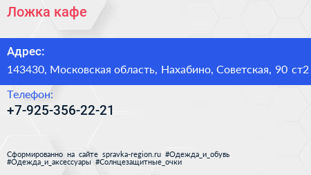 Ложка, кафе по адресу 143430, Московская область, Нахабино, Советская, 90 ст2 в дальнейшем Организация, размещена в следующих категориях: